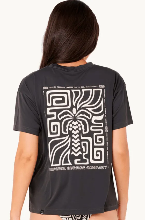 Rip Curl Sunset Luau Surf Lite Suntop in Washed Black features a crew neckline, short sleeves, sun protection rating, and is available in sizes S-L.