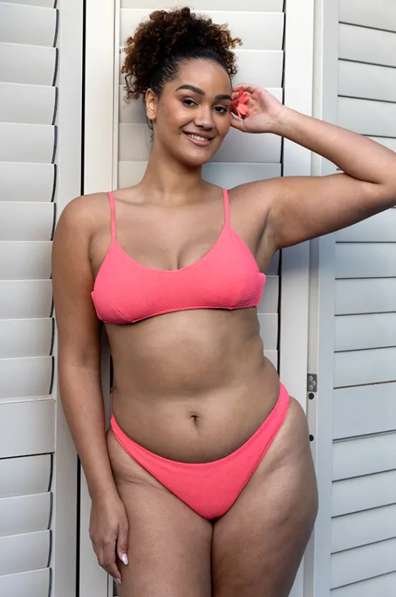 The Base Swim Textured Tie Back Bralette in Bright Coral features removable soft cups, convertible straps, textured fabric, and designed for A-D cup sizes.