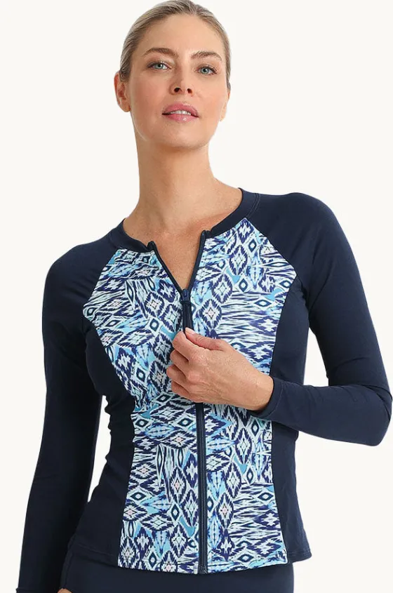 Poolproof Tide Long Sleeve Zip Suntop in Pacific features long sleeves, a full length front zipper, is chlorine resistant and is best suited to A-E cup sizes.