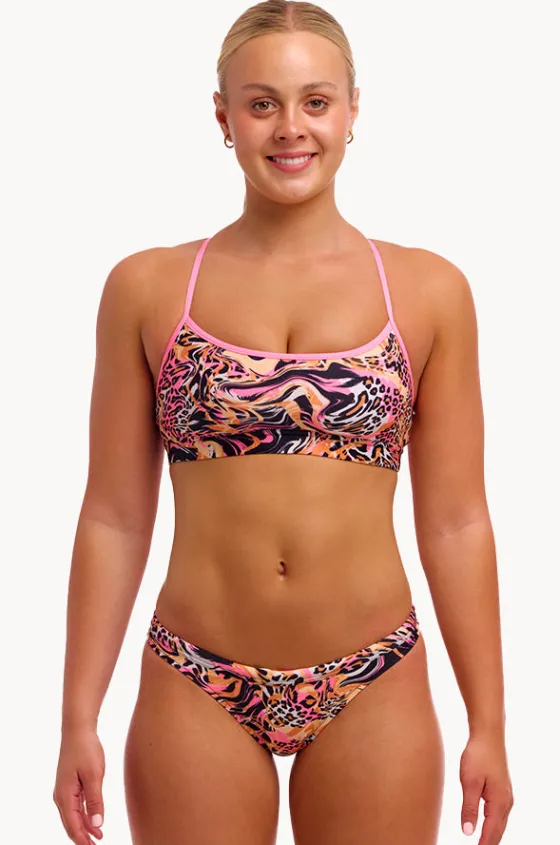Funkita Tipsy Tiger Crop Set in Animal features double bind straps, hipster pant with drawcord, chlorine resistant, and is best suited to A-C cup sizes.