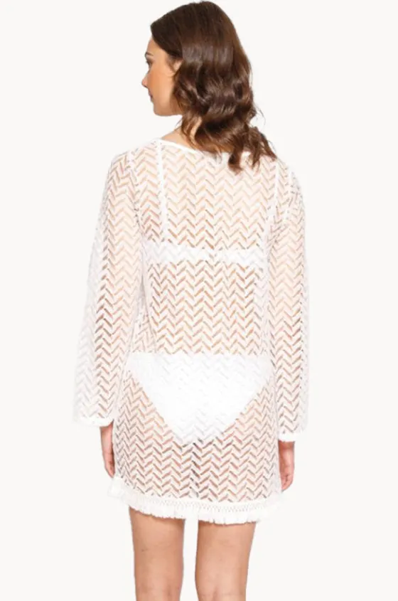 Koy Resort Zuma Tunic Dress in Natural features an open V-shaped neckline, front tie detail with tassel ends, long sleeves, short length with fringe hem.